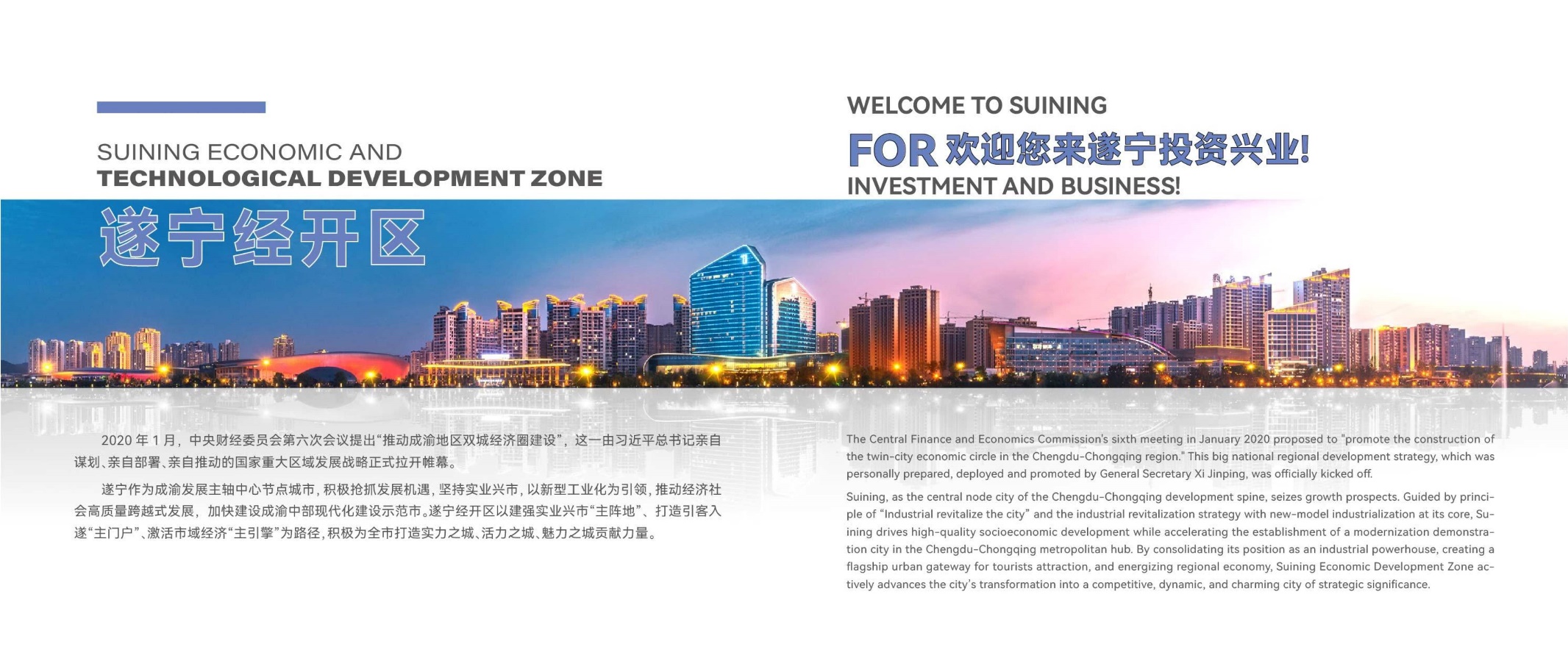 Located on the main axis of the Chengdu–Chongqing Twin-City Economic Circle, Suining is a city brimming with potential. It sits 128 kilometers from both Chengdu and Chongqing, and will soon reach the core of the two metropolitan areas within 30 minutes, with seamless connections to Beijing, Shanghai, Guangzhou and Shenzhen in just seven hours.